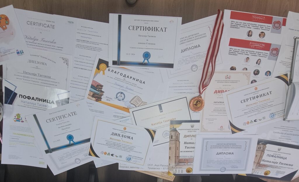 Како најголем предизвик во нејзиното средношколско образование таа ги посочи Државниот натпревар кој го оранизира Холандската амбасада, а на кој таа се натпреварувала со изготвено видео на тема ,,Спречување на корупцијата”, Интернационалниот натпревар по информатика и натпреварот по македонски јазик, од кој сеуште чека резултати, а ние ги издвојуваме следните достигнувања на Наталија, во учебната 2024/2025 година: