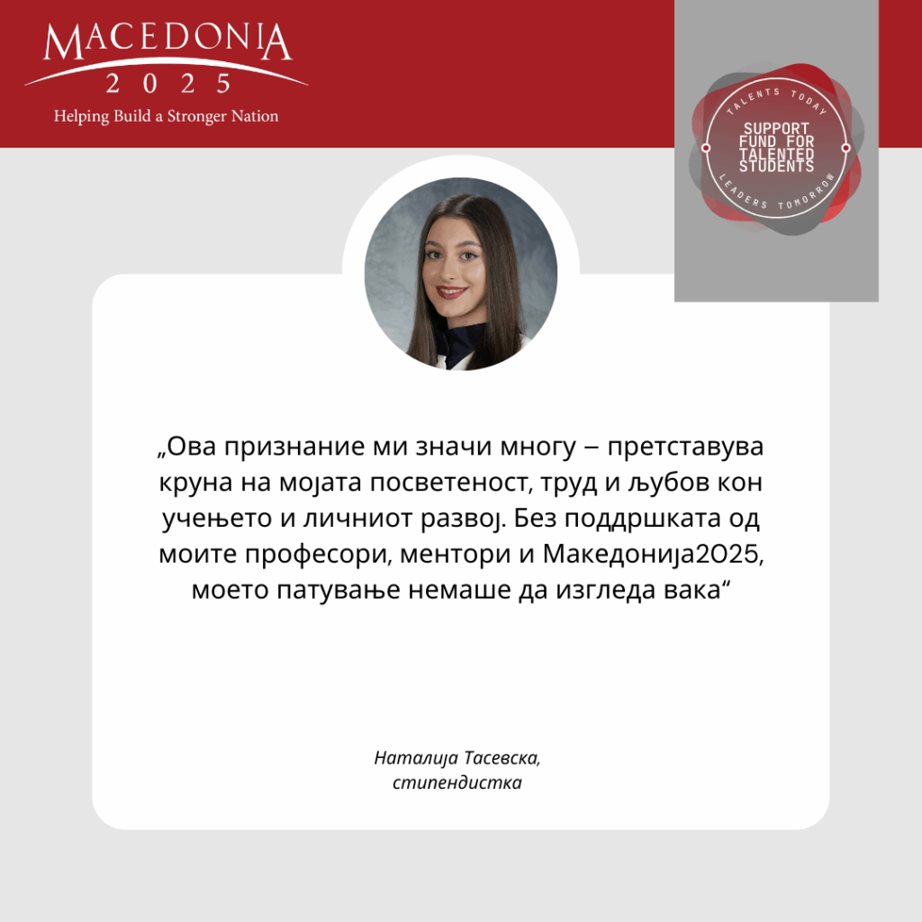 Две години по ред, таа е дел од стипендиската програма за талентирани средношколци “Таленти денес – лидери утре„ на Македонија 2025. Има учество и освоени награди на натпревари по Македонски јазик, информатика, хемија, бизнис и претприемништво, биологија а голем талент е и во уметноста и литературата. Нејзините ментори се поддржувачи, инспирација и мотив плус таа да напредува.