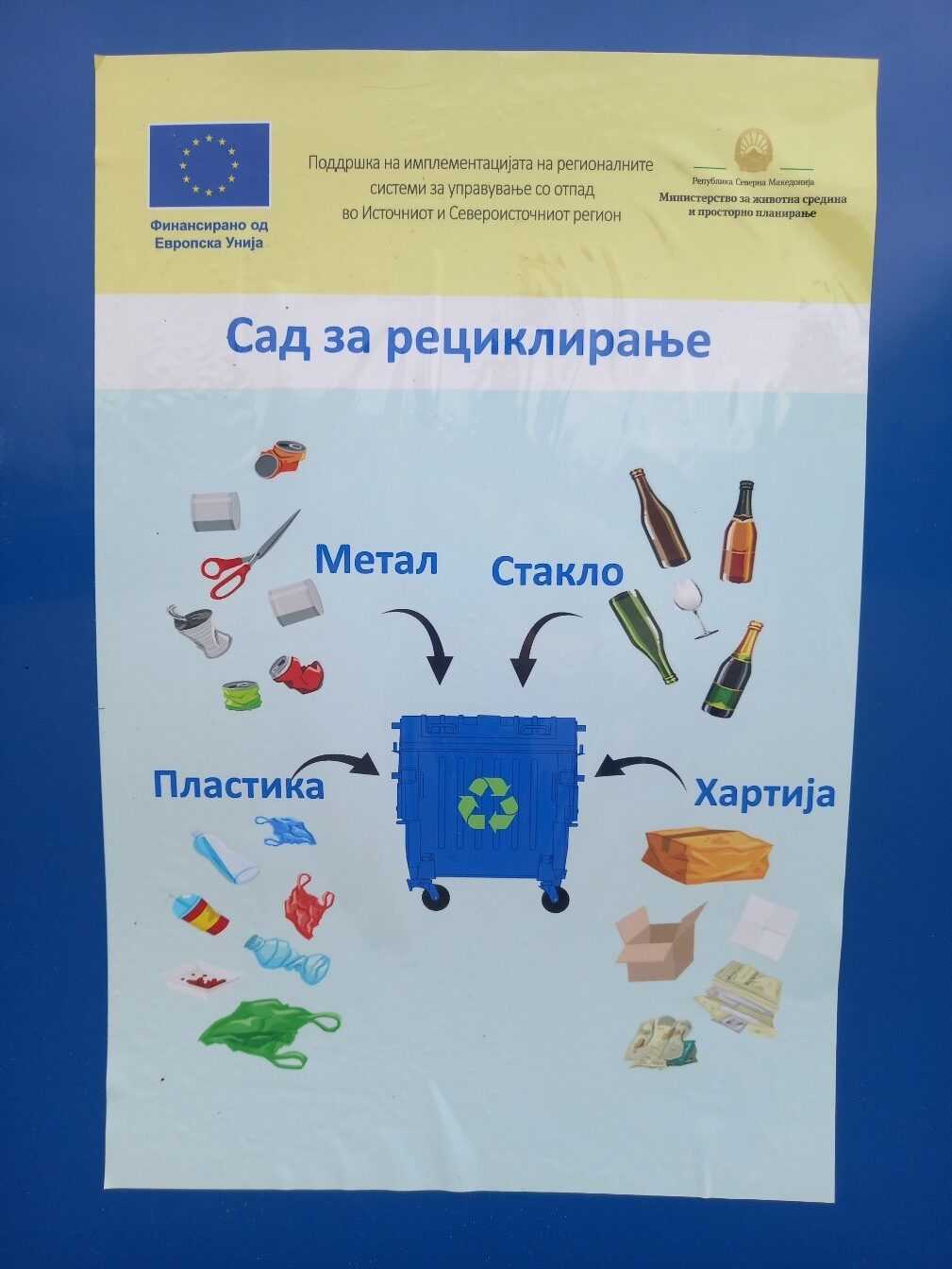 Целта на оваа  активноста е да се зголеми јавната свест, да се промовира правилното одлагање и рециклирање, како и да се поттикне активно учество на граѓаните во одржливите практики за заштита на животната средина. Поставената информативна табла обезбедува видливи упатства за тоа кој вид отпад каде припаѓа, што дополнително ќе придонесе за подобра селекција и намалување на количината на отпад што завршува на депонија.